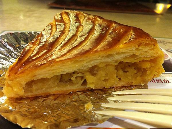 這款國王栗子派是法國人的年節點心,每當耶誕節的腳步近了,就是吃國王派的時候到了。傳說在國王派中吃到瓷偶或小戒指可以帶來一整年的好運,因此國王派在製作時通常會在派中放置一個瓷偶或小戒指,吃到瓷偶或小戒指的人就可以戴上紙皇冠當一天國王,並會擁有一整年的好運。而法朋除了販售單片的國王派之外,也有製作藏有瓷偶的整個國王派供預定,並遵循傳統附上紙皇冠,增添了國王派幾分的趣味性。想了解國王派故事更多的朋友請前往法國人的新年點心:國王餅(Galette des Rois) 。雖然國王派好吃又好玩,但對我而言稍嫌油膩,或許是因為千層派皮的關係,內餡的栗子泥倒是鬆軟可口,甜度適中。