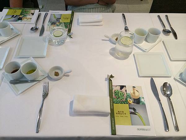 當天約有二十人參與這個小型聚會,一入座服務生便會斟上氣泡礦泉水。桌面上整齊地擺放了餐具、餐巾與O&CO的橄欖油、Balsamic酒醋和法式芥末醬供取用佐餐。
