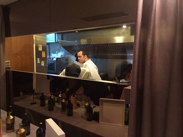 Fabien在廚房裡為為我們供餐而忙碌著。開放式廚房前還擺著許多O&CO的橄欖油與介紹說明。