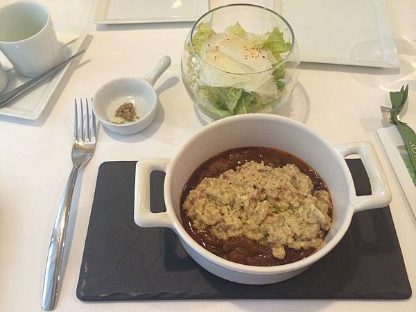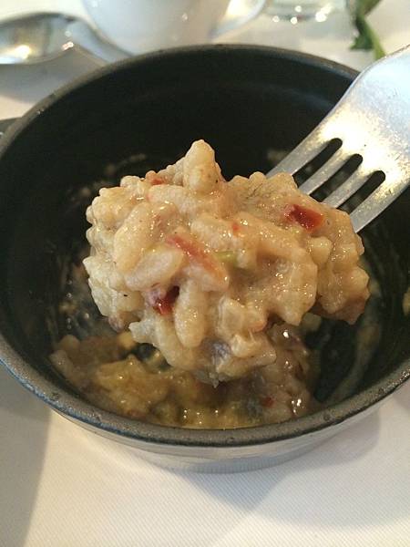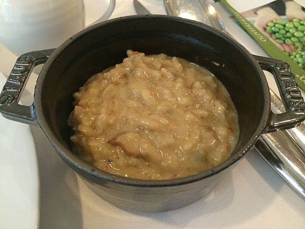 野菇燉飯風味獨特醇厚,米粒外層雖裹滿著醬汁,看起來軟爛,在口中卻粒粒飽滿而分明。