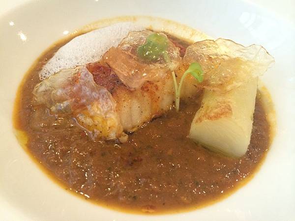選用澎湖秋姑魚、O&CO芫荽風味番茄醬、稀品翠綠葡萄牙小教堂莊園橄欖油所完成的一道料理。上面接近透明的薄片是橄欖油煎的馬鈴薯片,薄脆而美麗,外觀很像糖片,抱著好奇的心情夾起一片放入口中,完全沒有一點點討厭的油味和油膩感,取而代之的卻是只是單純的橄欖油的青草香與馬鈴薯本身散發出的自然香甜。白色泡泡是Fabien常用的料理手法,很像是一種輕盈的高湯,十分細緻清新,增加了整道料理的風味層次卻不厚重、油膩,但單吃會有點空虛。料理的主角秋姑魚嚐起來軟嫩,鮮美,有著濃濃的大海的味道,搭配著泡泡與芫荽番茄醬食用味道變化更豐富美味。秋姑魚旁的是煎烤過的馬鈴薯條,雖然都是馬鈴薯,但是口感和薯片完全不同,十分軟Q,馬鈴薯味道一樣濃厚而香甜。這是一道非常漂亮,也非常美味的料理,讓我很驚豔。