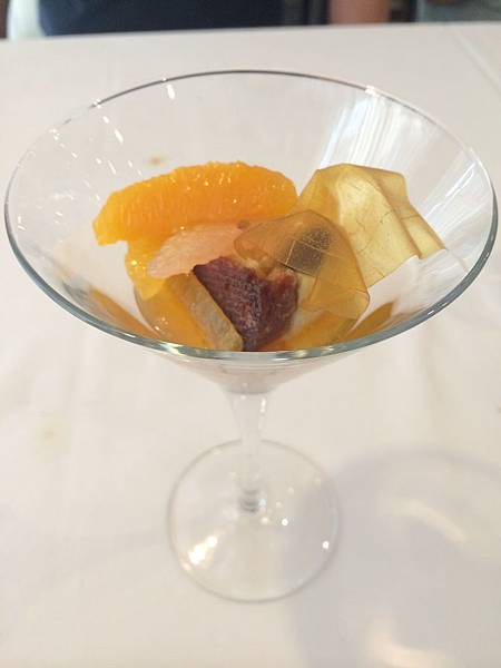 最下層是酸甜的法國檸檬橄欖果醬,再來是香甜的法國普羅旺斯蜜桃&杏桃果醬,檸檬塔擺放在杏桃果醬上面,加入O&CO葡萄牙小教堂蜜柑檸檬橄欖油製作,上層入口即化,下層類似餅乾的酥脆口感,最後放上新鮮的柳橙、葡萄柚片和美麗的百香果糖衣紙,組合出清新誘人的一品,十分賞心悅目。